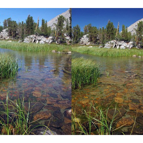 Не секрет, что небо на фотографиях пейзажей часто получается блеклым, пересвеченым, белесым или неестественно бледно-голубым. Это происходит от того, что яркость неба обычно превышает яркость окружающего ландшафта на несколько единиц экспозиции. Данный фильтр служит для исправления этой особенности при съемке пейзажей - с его помощью можно при съемке затемнить верхнюю часть будущего снимка и получить проработанное, яркое, насыщенное небо с объемными и прорисованными облаками. Наружная рамка фильтра вращается (по типу поляризационного фильтра), благодаря чему можно затемнить именно нужную часть снимка под любым углом.