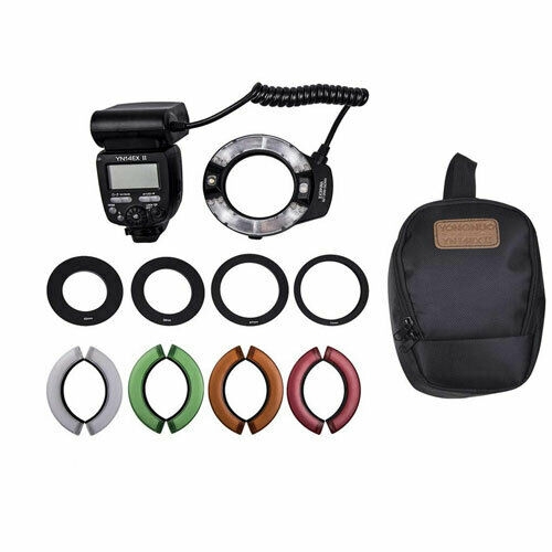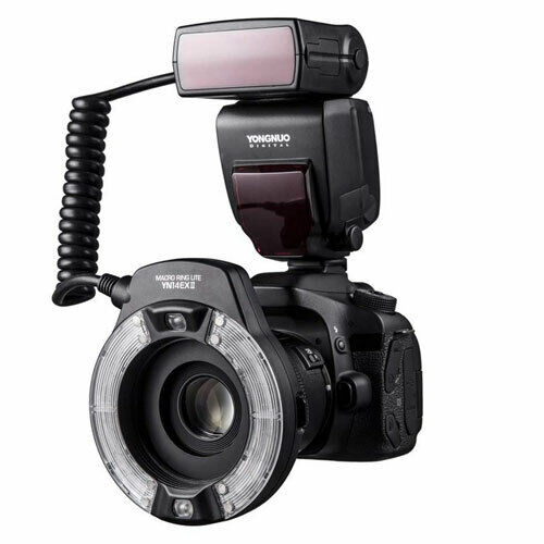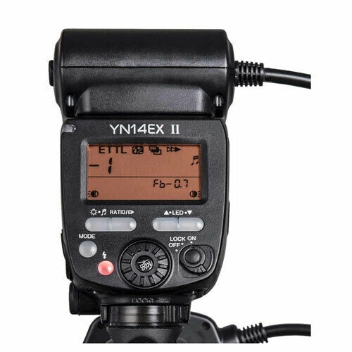 Вспышка для макросъемки YongNuo YN-14EX имеет в комплекте набор переходников для установки на объективы различного диаметра: 52, 58, 67 и 72 мм. При необходимости можно докупить переходники других диаметров. Также кольцевая вспышка YN-14EX для макросъемки оснащена светодиодной подсветкой автофокуса, большим ЖК-дисплеем, облегчающим управление устройством, и поддерживает звуковую индикацию, оповещающую пользователя о режиме работы. Синхроразъем PC SYNC позволяет запускать вспышку через PC-кабель, а скорость перезарядки при полностью заряженной батарее составляет не более 3-х секунд. Кроме этого, вспышка имеет разъем для подключения внешнего батарейного блока, который позволит существенно продлить рабочую сессию и ускорит перезарядку. Параметры, установленные для работы вспышки, автоматически запоминаются. Кольцо вспышки состоит из двух ламп Вспышка поддерживает управление соотношением мощности ламп-вспышек А и В. Таким образом вы можете управлять теневым рисунком. Полностью поддерживает все TTL-функции Компенсация экспозиции, синхронизацию по 2-ой шторке, моделирующий свет, FEB, FE lock Крупный ЖК-дисплей Крупный дисплей делает управление вспышкой более удобным. Светодиодная подсветка АФ. Высокая яркость вспомогательных светодиодов для фокусировки увеличивают скорость фокусировки объектива. Светодиод проецирует сетку для упрощения процесса фокусировки. Универсальное крепление: в комплект входит набор переходников на диаметры: 52 мм, 58 мм, 67 мм, 72 мм. Синхроразъем PC предназначен для запуска вспышки через PC кабель. Звуковая индикация оповещает во время съемки о режиме работы вспышки (зарядка/готовность). Высокая скорость перезарядки. При полностью заряженный батареях скорость перезарядки составляет всего 3 с. Возможность подключения внешнего блока питания.